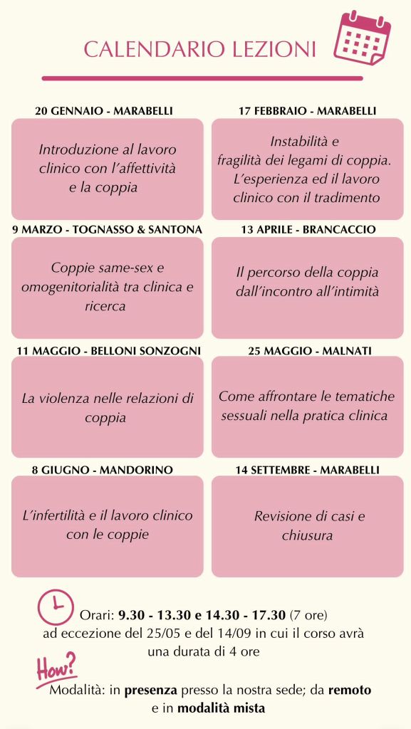 Così per tutti questi motivi e non solo nell’Istituto Psicologico Italiano (IPSI), il centro clinico dove lavoro a Milano, per il prossimo anno abbiamo pensato con cura e progettato con attenzione questo corso “Il lavoro clinico con l’affettività e le coppie”.